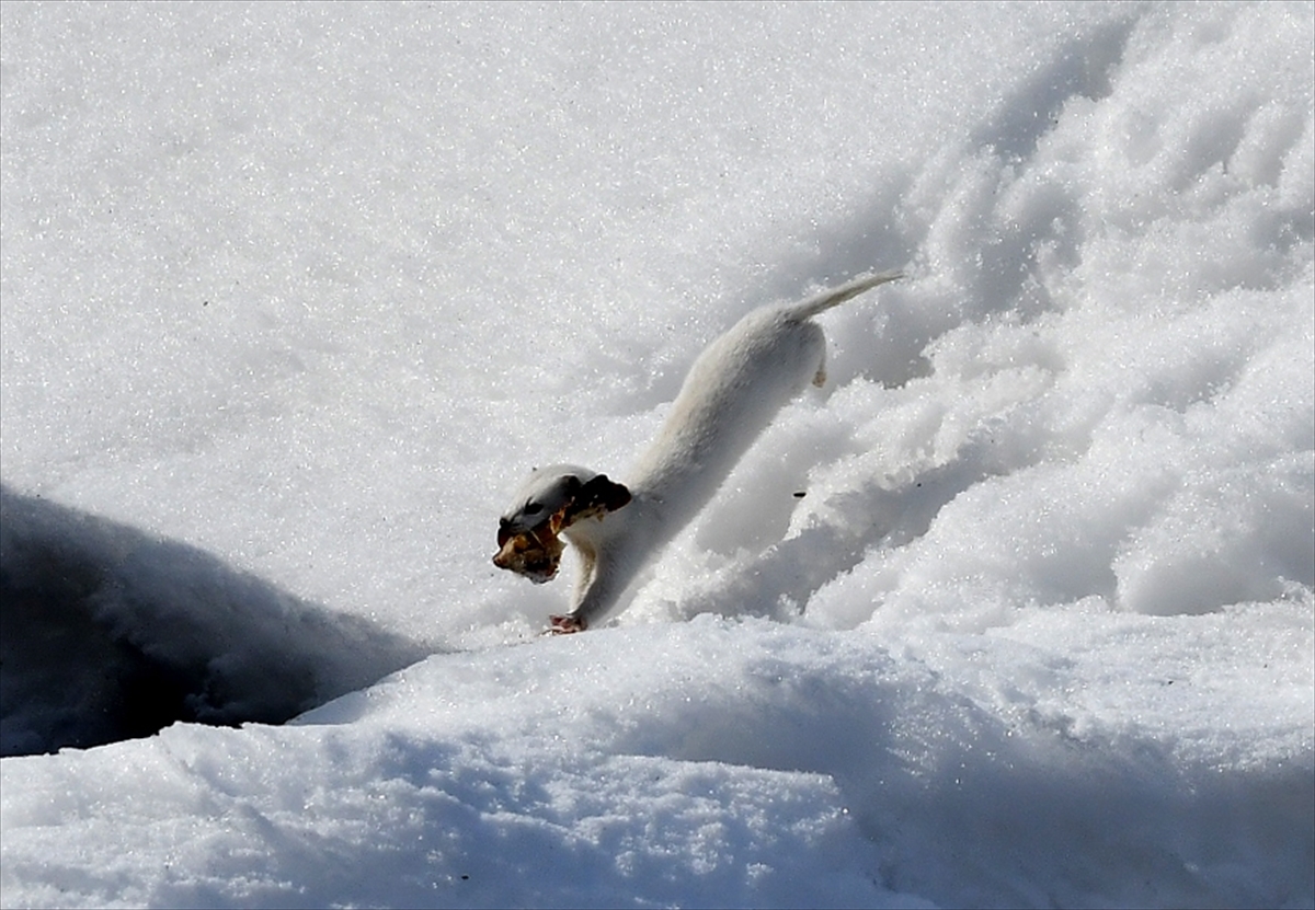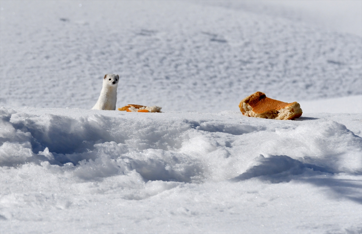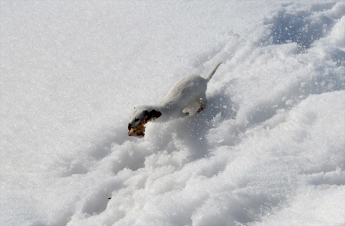 Kar kalınlığının yer yer 1,5 metreyi bulduğu 2 bin 400 rakımlı Acısu bölgesinde beyaz gelincik, kar üzerindeki ekmek ve kemik kırıntılarını yuvasına taşırken kayda alındı.