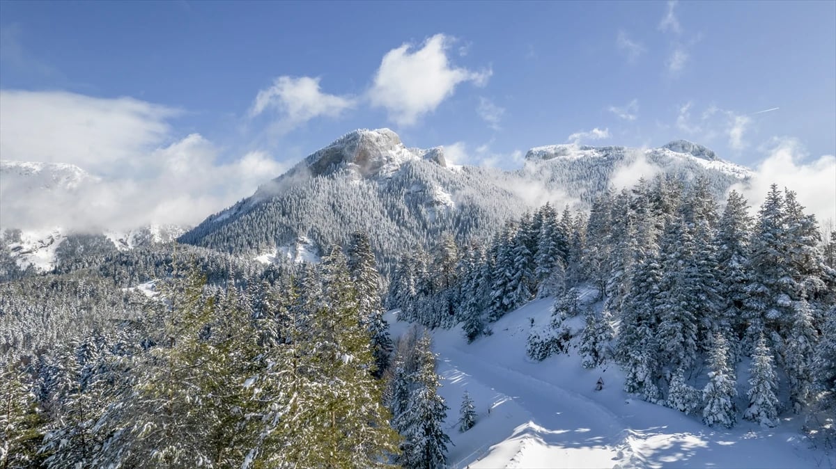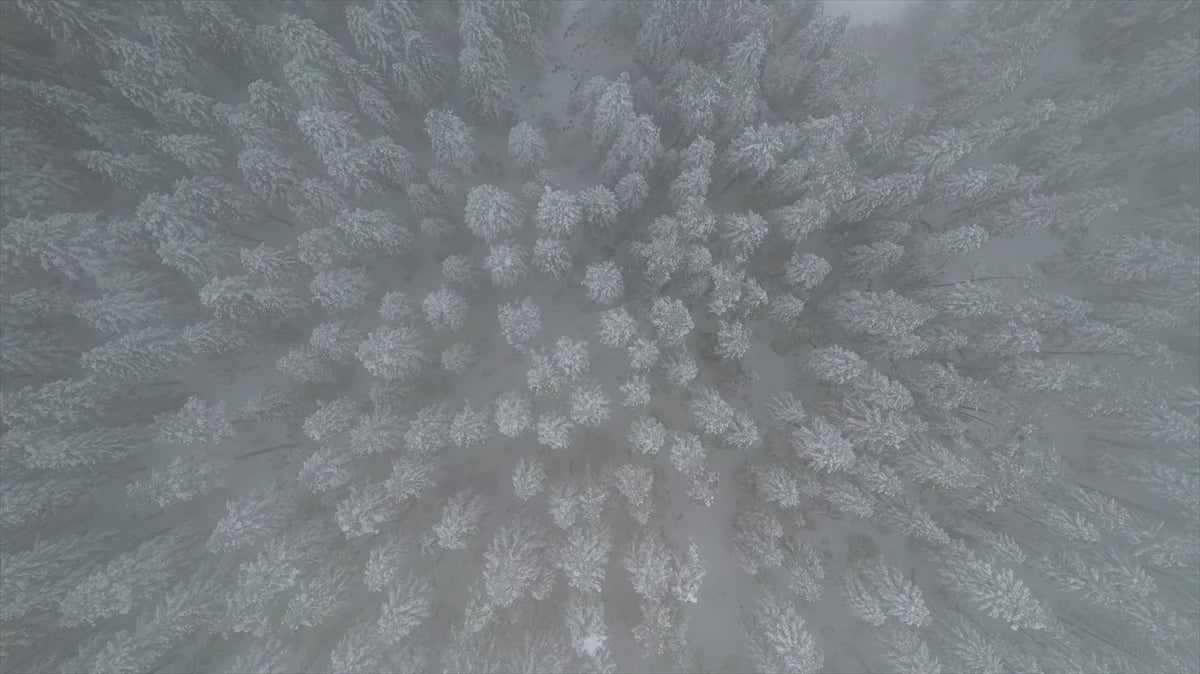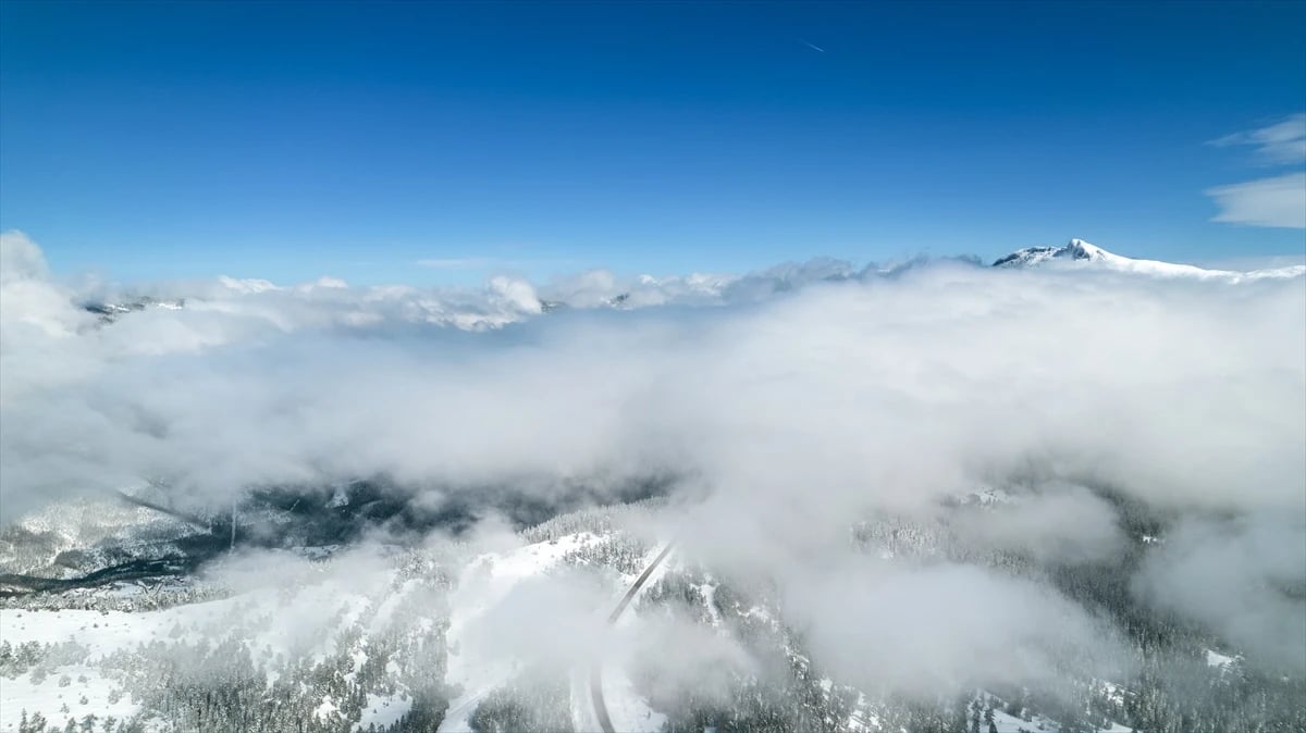 Gökyüzünün mavisiyle birleşen karlı zirveler ve sisli ormanların büyüleyici güzelliği dron kameralarıyla saniye saniye kaydedildi.