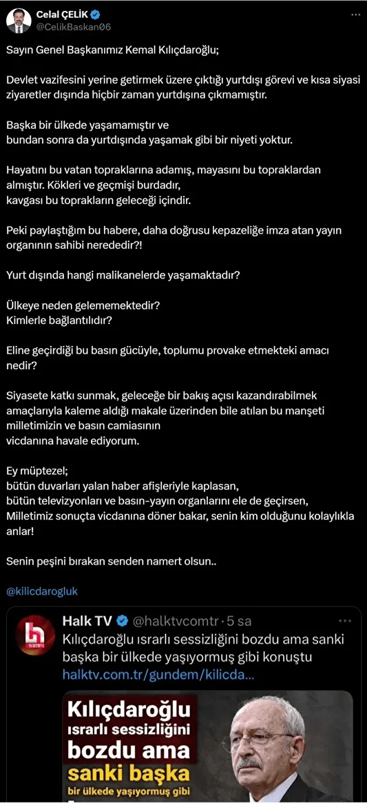 CHP eski Genel Başkanı Kemal Kılıçdaroğlu’nun yazısı üzerinden başlayan tartışma büyüdü. Halk TV’nin haberine tepki gösteren Kılıçdaroğlu’nun avukatı Celal Çelik, kanalın sahibi Cafer Mahiroğlu’nu hedef aldı.