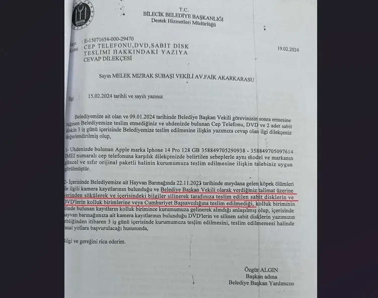 - Belediye yazışmalarında, sabit disklerin silinip Başkanlık makamına teslim edildiği ve savcılığa iletilmediği net şekilde yer aldı.