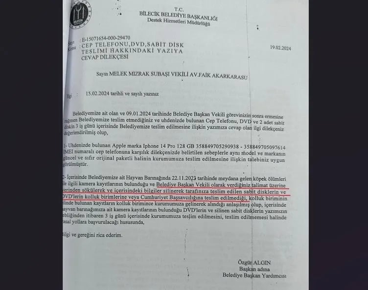 - 22 Kasım 2023’te onlarca köpeğin öldürülüp ormana atıldığı olayın ardından, CHP’li Bilecik Belediye Başkanı Melek Mızrak Subaşı’nın sabit disklerin silinmesi talimatını verdiği ortaya çıktı.