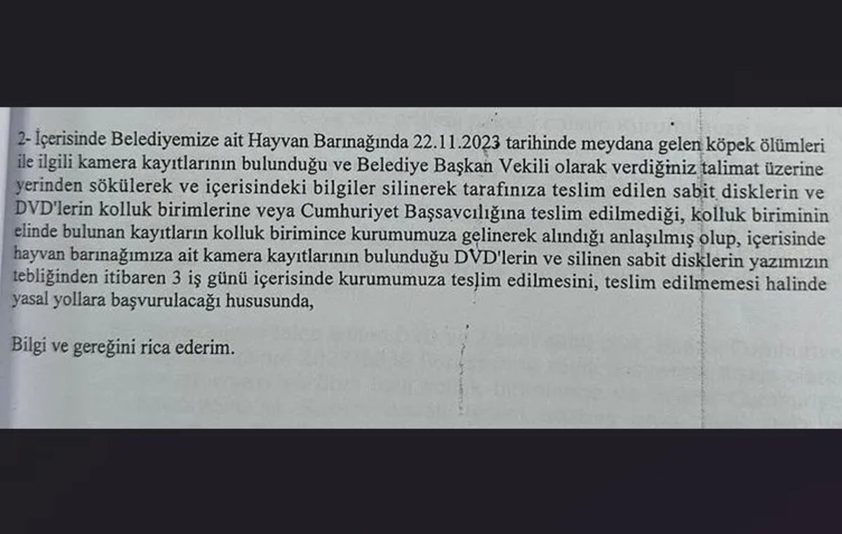 Sabah gazetesinin ulaştığı resmi belgeler, olayın üzerinin örtülmeye çalışıldığını ortaya koydu. Belediye ile soruşturmayı yürüten muhakkik arasında yapılan yazışmalarda, Melek Mızrak Subaşı'nın talimatıyla barınağa ait kamera sistemindeki sabit disklerin söküldüğü ve görüntülerin silindiği belirtildi.