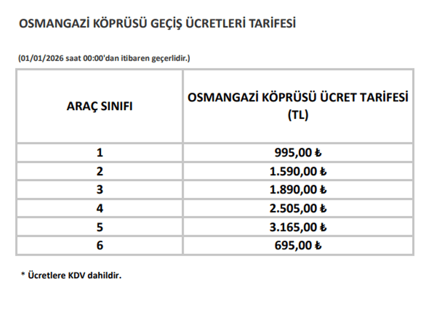 - Osmangazi Köprüsü geçiş ücreti otomobiller (Araç Sınıfı 1) için yeni yıldan itibaren 995 TL olarak uygulanacak.