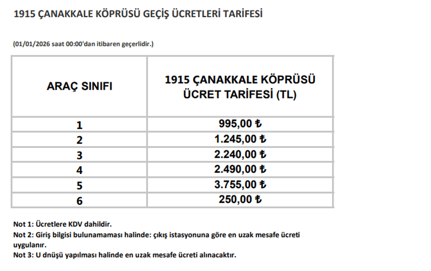 Osmangazi Köprüsü'nde en yüksek geçiş ücreti 3.165 TL ile 5. sınıf araçlara ait olurken, 1915 Çanakkale Köprüsü'nde aynı sınıf araçlar için ücret 3.755 TL olarak duyuruldu. Karayolları Genel Müdürlüğü, tüm bu ücretlere KDV'nin dahil olduğunu ve 1 Ocak itibarıyla sistemin devreye gireceğini belirtti.