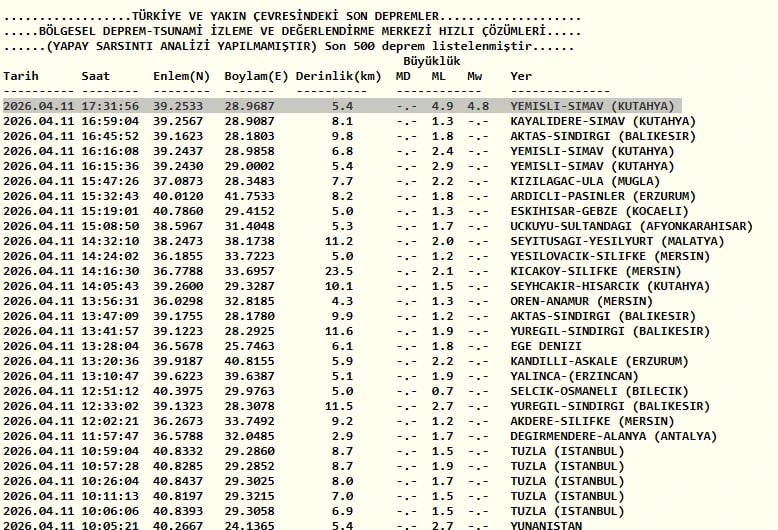 SON DAKİKA KÜTAHYA DEPREM VERİLERİ
