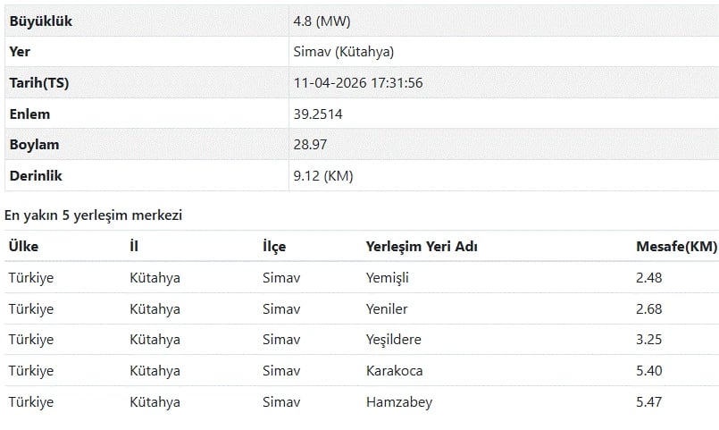 AFAD tarafından paylaşılan bilgilere göre ise 11 Nisan saat 17:31’de meydana gelen deprem yerin 9.12 kilometre derinliğinde ve 4.8 şiddetinde meydana geldi.