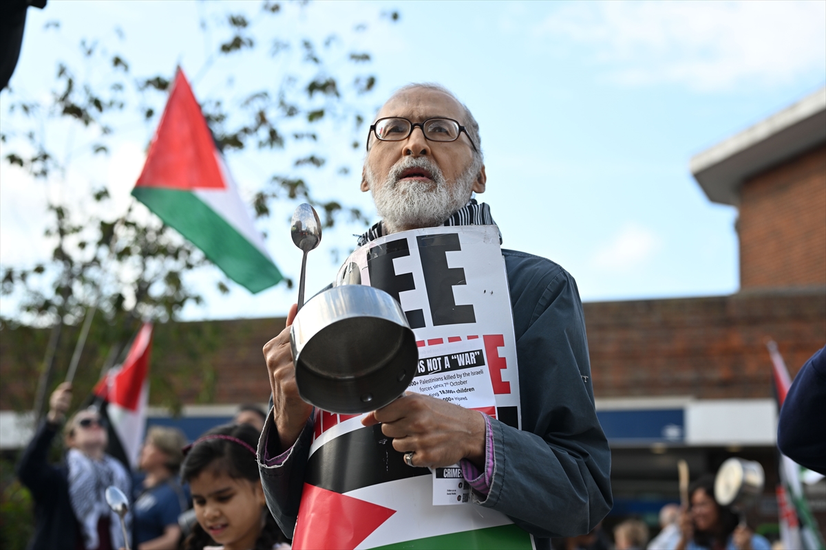 İngiltere’nin başkenti Londra’da ellerindeki Filistin bayraklarıyla toplanan halk, İsrail’in açlığı bir savaş silahı olarak kullanmasını protesto etti.