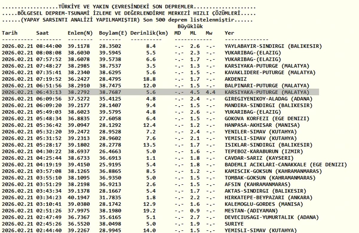 AFAD ve Kandilli Rasathanesi son depremler listesi | 21 Şubat Türkiye'deki son depremler