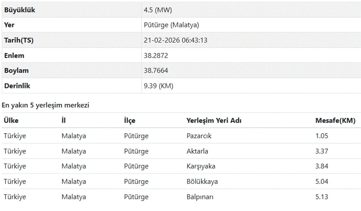 21 Şubat Cumartesi günü Malatya'nın Pütürge ilçesinde saat 06.43'te 4.5 şiddetinde bir deprem meydana geldi.