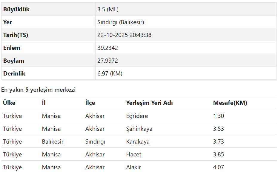 AFAD son depremler listesi verilerine göre ise depremin merkez üssü Balıkesir Sındırgı olarak açıklandı. Şiddeti 3.5 olarak duyuruldu.