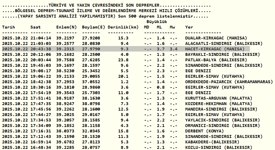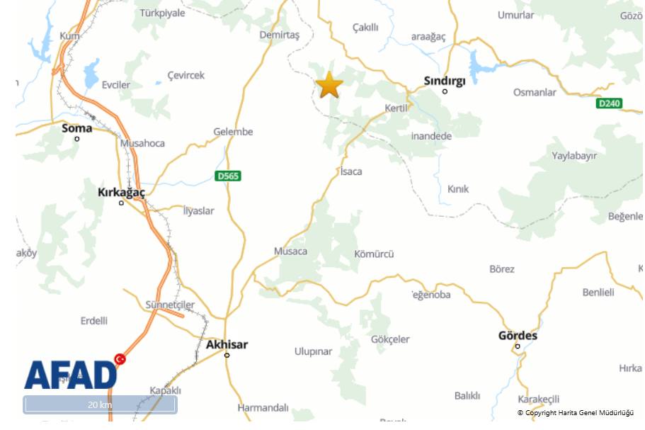 Kandilli Rasathanesi son depremler listesi verilerine göre Manisa'nın Kırkağaç ilçesinde saat 20.43'te 3.7 şiddetinde bir deprem meydana geldi.