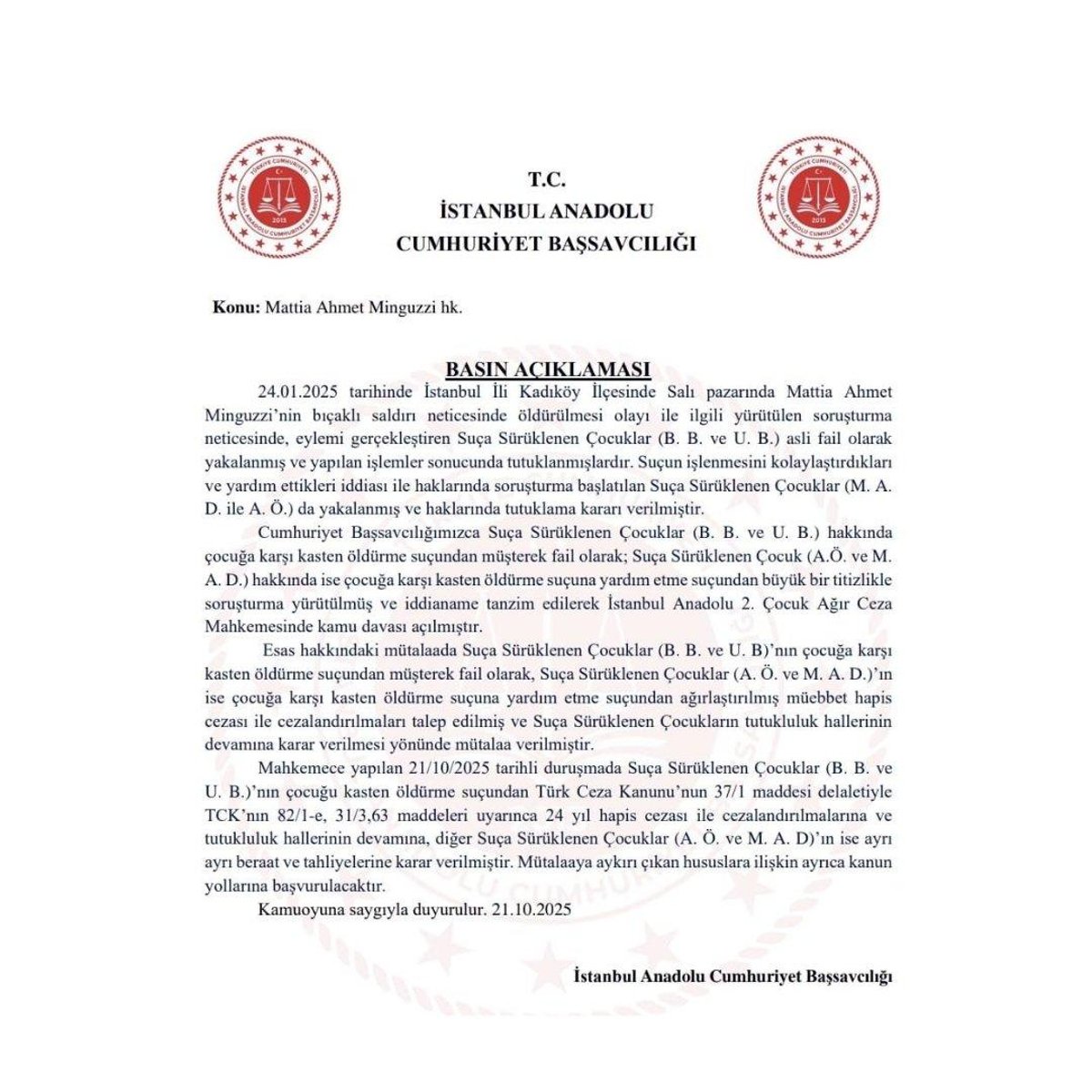İstanbul Kadıköy’de pazarda bıçaklanarak hayatını kaybeden 15 yaşındaki Mattia Ahmet Minguzzi’nin davasında karar çıktı. Kartal’daki Anadolu 2. Çocuk Ağır Ceza Mahkemesi'nde görülen davada, mahkeme heyeti dört sanık hakkında hükmünü verdi.
