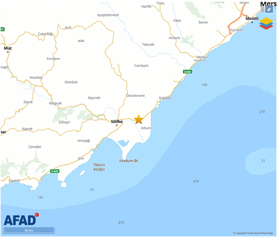 AFAD tarafından yayımlanan Mersin deprem verilerine göre sarsıntının merkez üssü Silifke ilçesi olarak açıklandı.