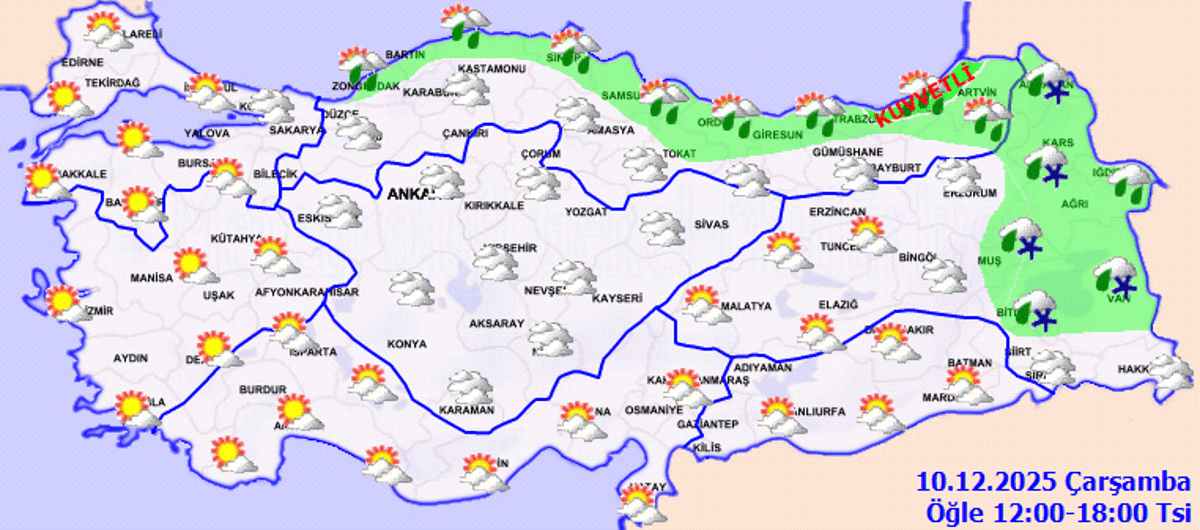 Genellikle yağmur ve sağanak, Doğu Anadolu'nun doğusu ile Sivas çevrelerinde karla karışık yağmur ve kar şeklinde görülmesi beklenen yağışların, Orta ve Doğu Karadeniz kıyılarında yer yer kuvvetli olacağı tahmin ediliyor.