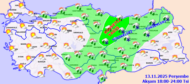 13 Kasım günü ülkemiz genelinin parçalı ve çok bulutlu, Marmara’nın doğusu, Orta ve Doğu Akdeniz, İç Anadolu’nun güney ve doğusu, Karadeniz, Doğu Anadolu’nun kuzey ve batısı, Güneydoğu Anadolu’nun batısı ile Antalya, Bingöl ve Diyarbakır çevrelerinin yağmur ve sağanak yağışlı.