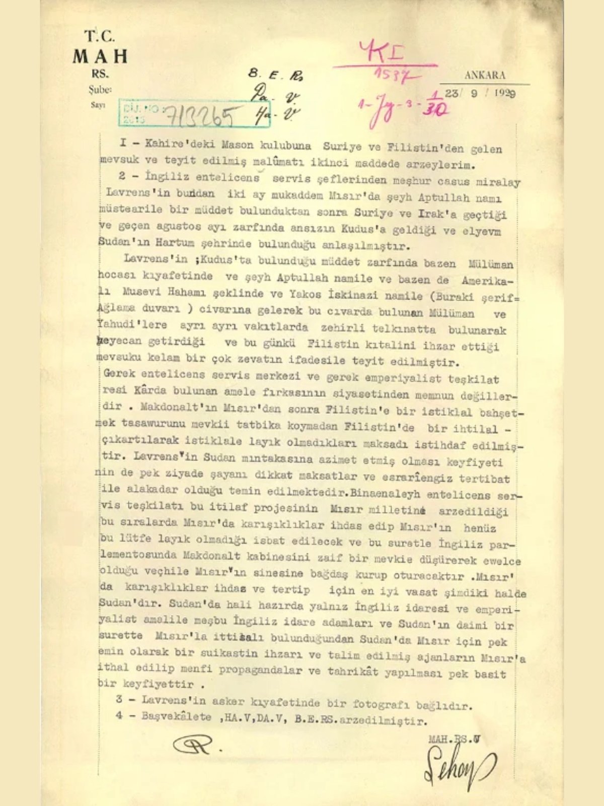 Milli İstihbarat Teşkilatı (MİT), resmi internet sitesindeki Özel Koleksiyon – Belgeler bölümünde yeni bir arşiv belgesini yayımladı. Paylaşılan belge, Osmanlı sonrası dönemde Ortadoğu’da aktif rol oynayan İngiliz ajanı Thomas Edward Lawrence hakkında Milli Emniyet Hizmeti Riyaseti tarafından 23 Eylül 1929’da hazırlanan istihbarat raporu oldu.
