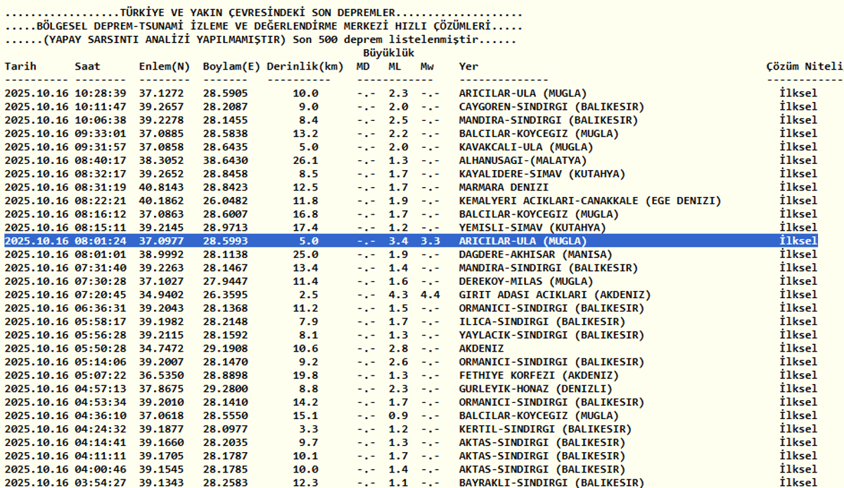 SON DAKİKA MUĞLA DEPREM VERİLERİ