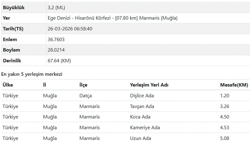 26 Mart AFAD ve Kandilli Rasathanesi son depremler listesi verilerine göre Muğla depremle sallandı. Marmaris Bozburun merkezli depremin ardından sarsıntı hisseden bölge sakinleri detayları son dakika Muğla'da deprem mi oldu, kaç şiddetinde? şeklinde araştırıyor.