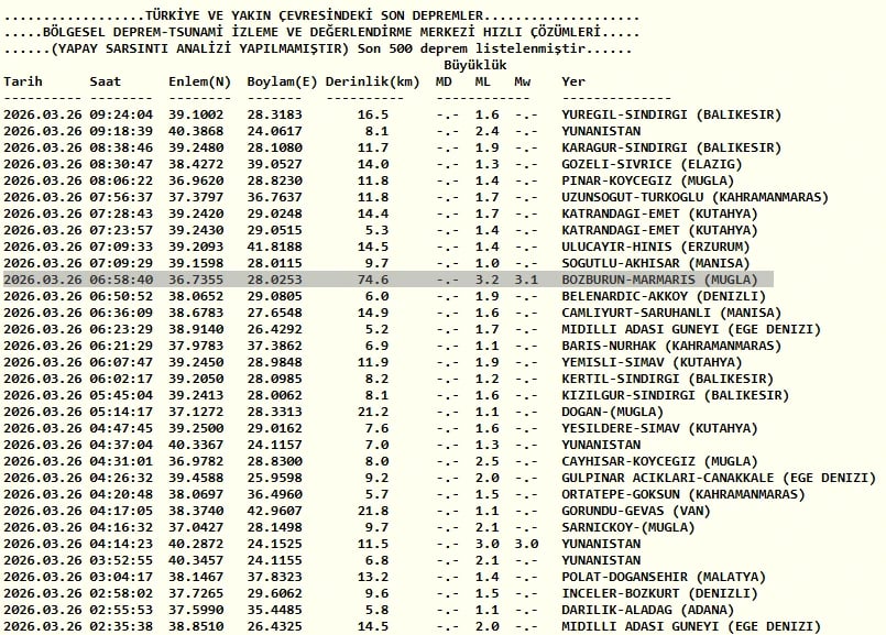 26 Mart AFAD ve Kandilli Rasathanesi son depremler listesi verileri şöyle;