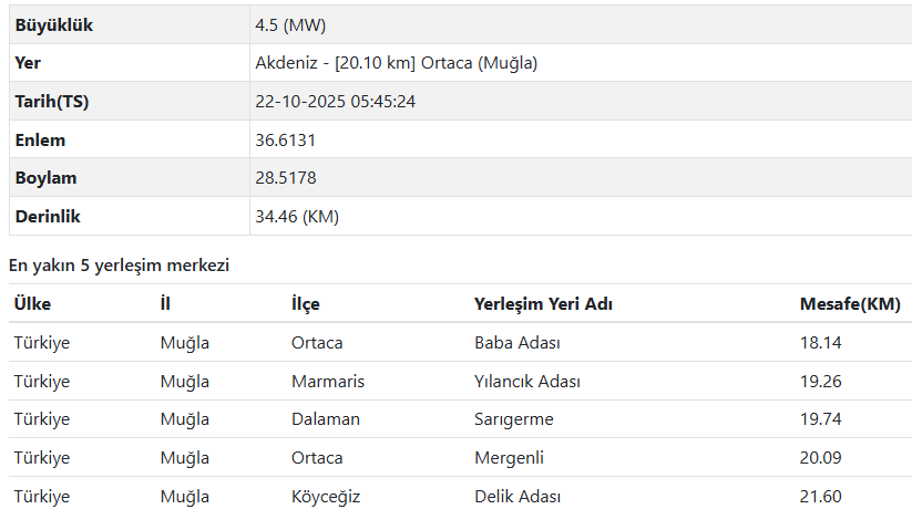 AFAD deprem verilerine göre ise Muğla açıklarında meydana gelen deprem yerin 34.46 kilometre derinliğinde 4.5 şiddetinde meydana geldi.