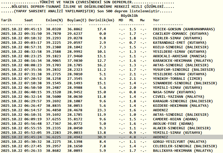 Kandilli Rasathanesi ve AFAD son depremler listesi verileri ve tüm detaylar şöyle;