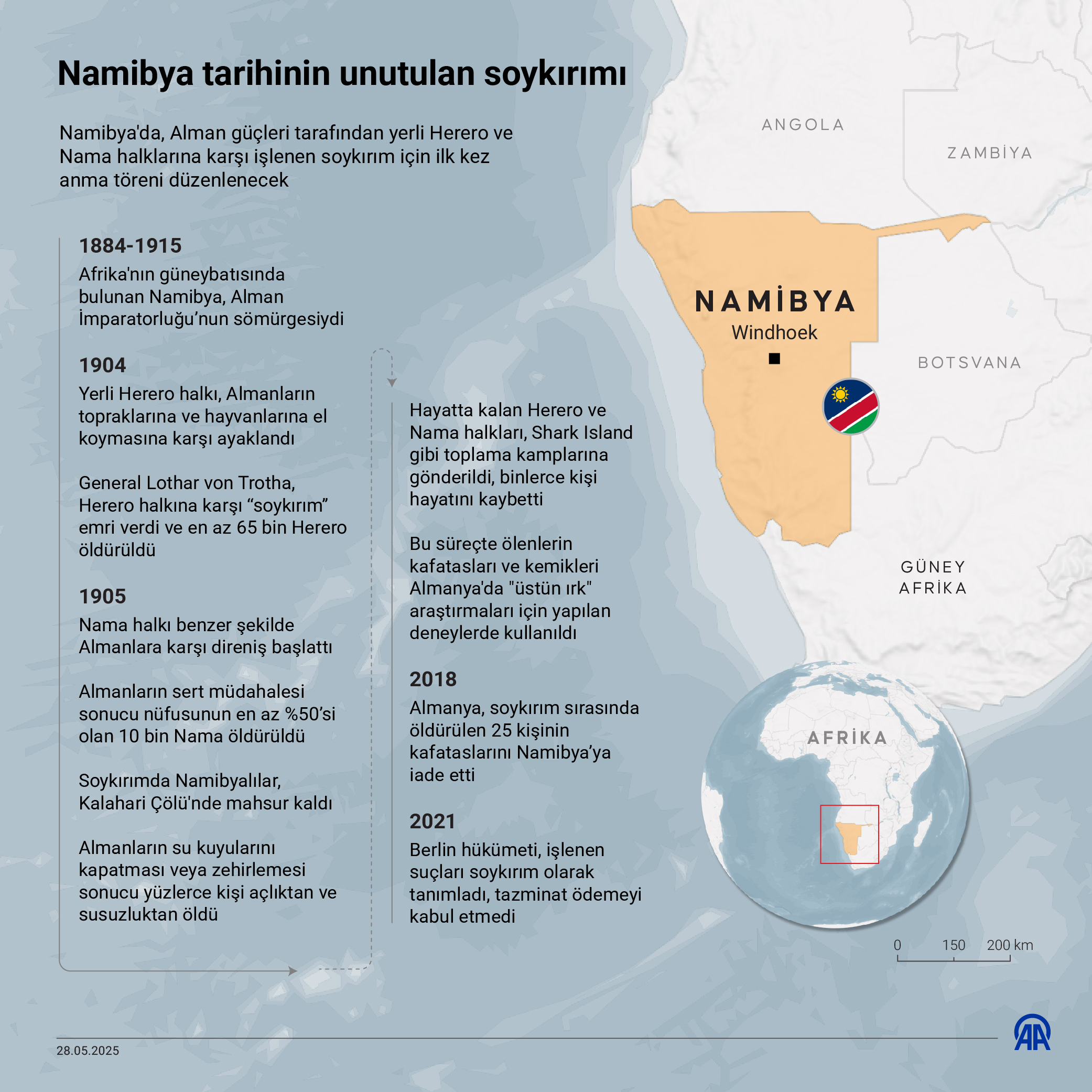 Namibya, ülkenin Almanya tarafından sömürge yönetimi altında olduğu dönemde (1904-1908) gerçekleştirilen Herero ve Nama soykırımının kurbanlarını anmak için ilk kez 28 Mayıs’ta resmî bir "soykırımı anma günü" düzenledi.