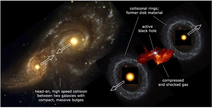 Bu çarpışmanın ortasında ise, Güneş’in yaklaşık bir milyon katı kütleye sahip genç bir kara delik bulunuyor. Devasa bir gaz bulutunun içinde yer alan bu kara delik, doğrudan çöküş teorisinin canlı bir örneği olabilir. Zira iki galaksinin çarpışması sırasında gaz yoğunlaşarak yoğun bir düğüm oluşturmuş ve bu yapı doğrudan çökerek bir kara delik oluşturmuş olabilir.