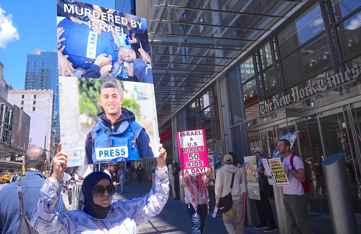 New York Times’ın önünde toplanan aktivistler, gazetenin soykırım karşısında sessiz kalmasını eleştirirken, Gazze’de öldürülen gazetecileri de andı.