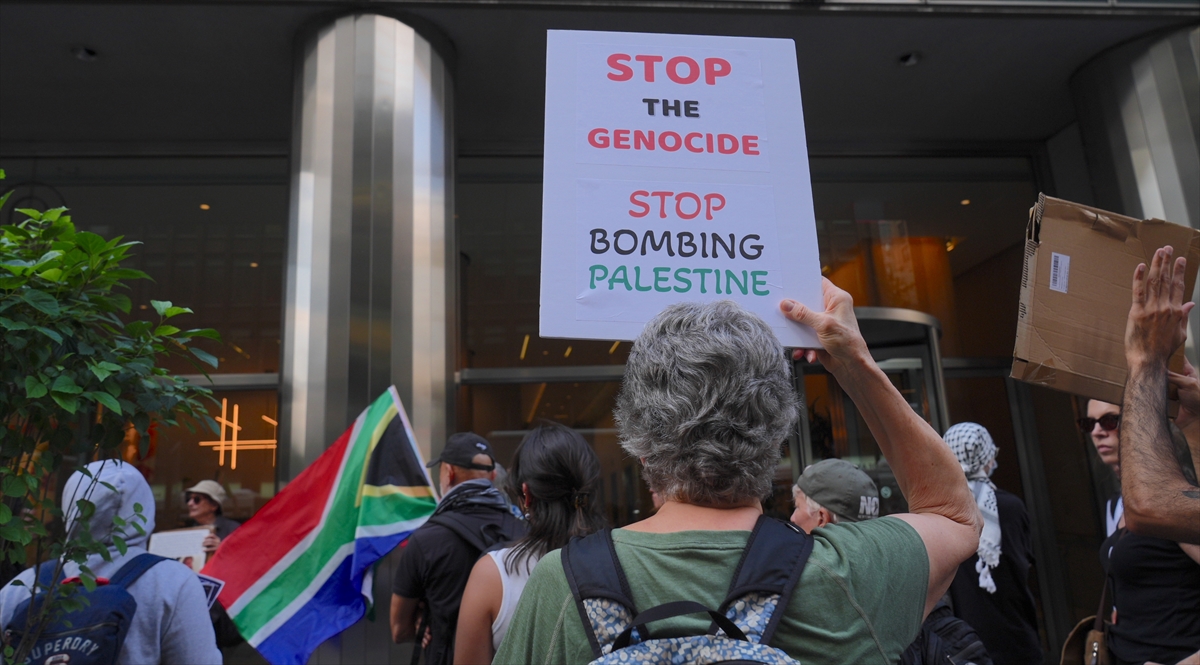 Ayrıca göstericiler, İsrail’in soykırımını Uluslararası Adalet Divanı’na taşıyan Güney Afrika’nın bayrağını da taşıdı.
