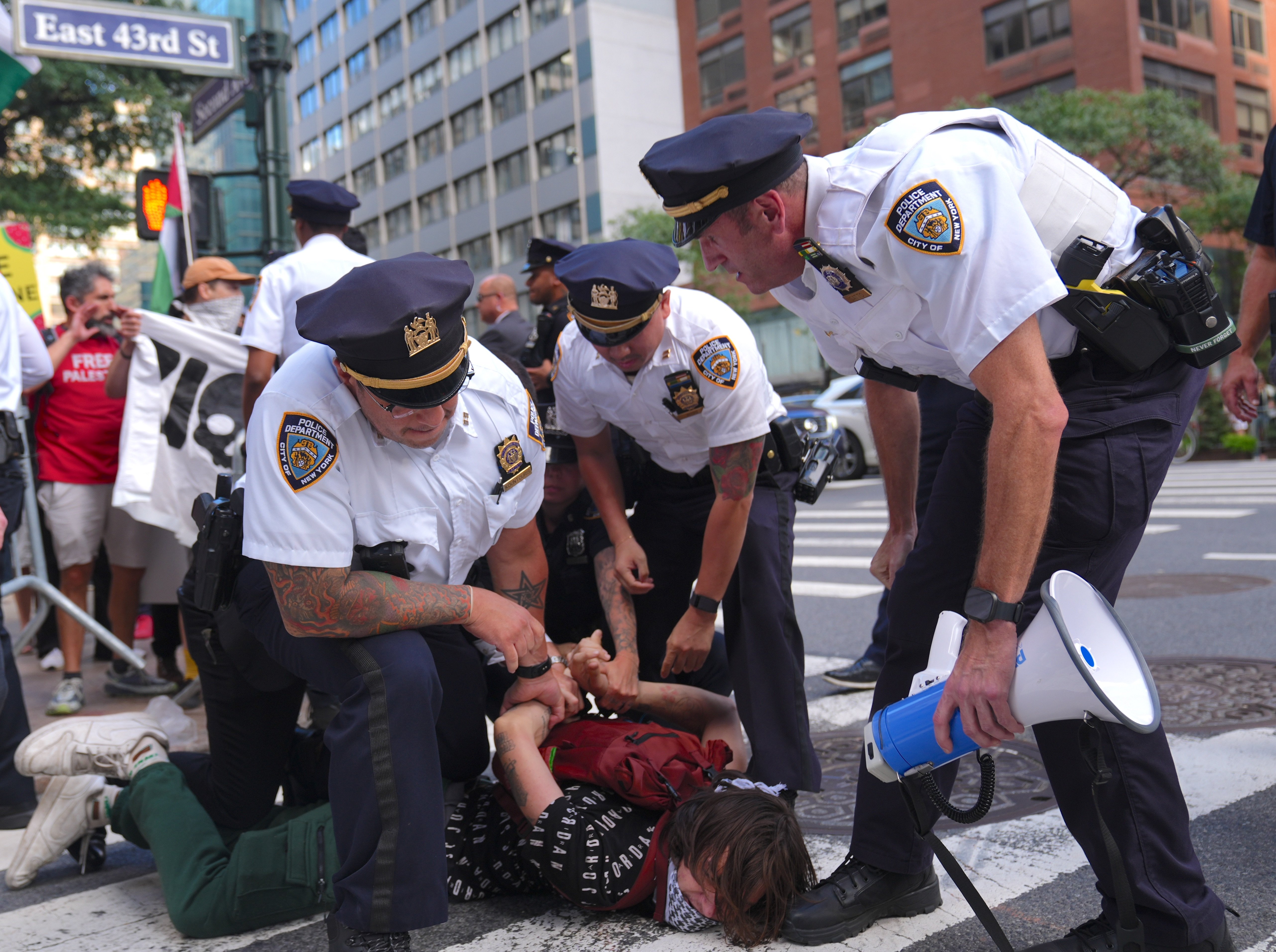 Göstericiler, BM merkezinin karşısındaki 46’ncı sokağa yürüyerek “Özgür Filistin, Özgür Gazze” sloganları attı.