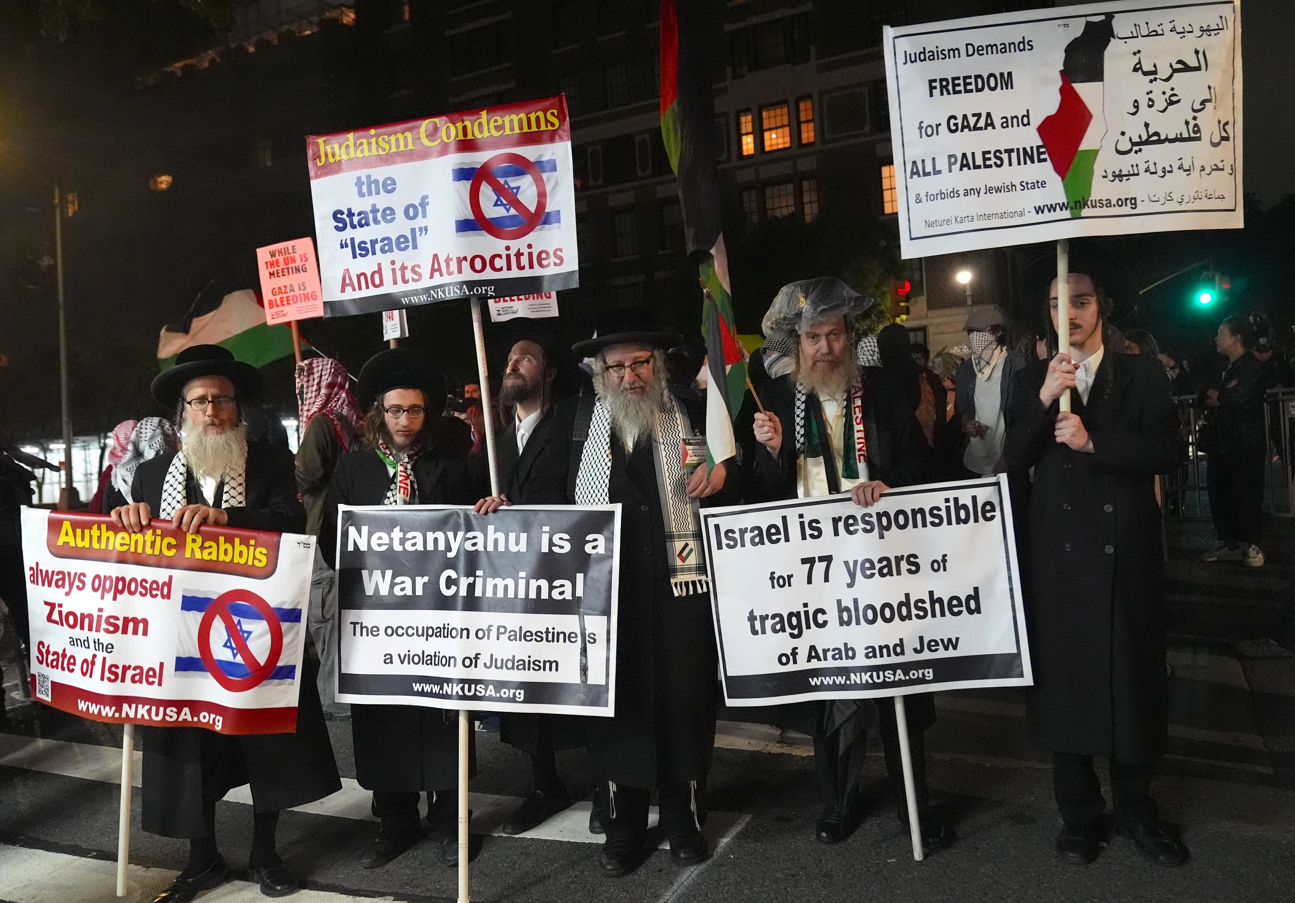 Göstericiler, Trump ve Netanyahu’nun ikili görüşmesine atıfta bulunarak ateşkes ve kalıcı barış taleplerini dile getirdi. Gösteriye antisiyonist Yahudi lider Haham Dovid Weiss da katıldı.
