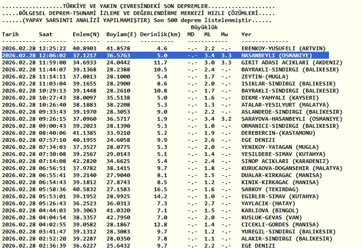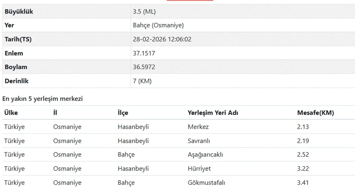 Kandilli Rasathanesi son depremler listesi verilerine göre 28 Şubat saat 12.06'da Osmaniye'de 3.4 şiddetinde bir deprem meydana geldi.