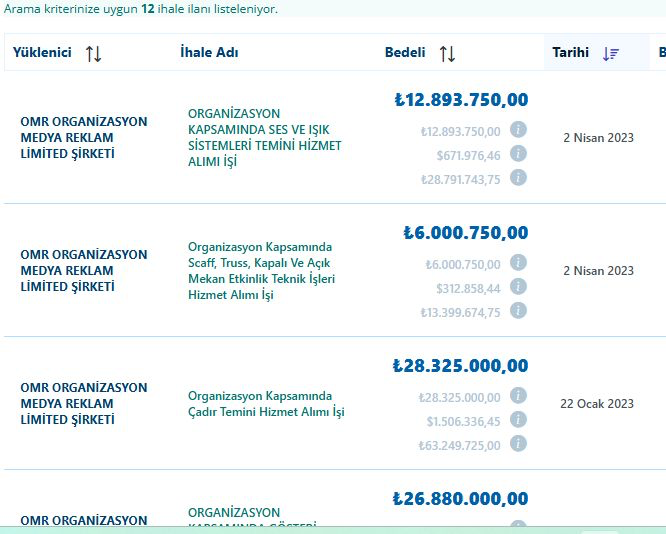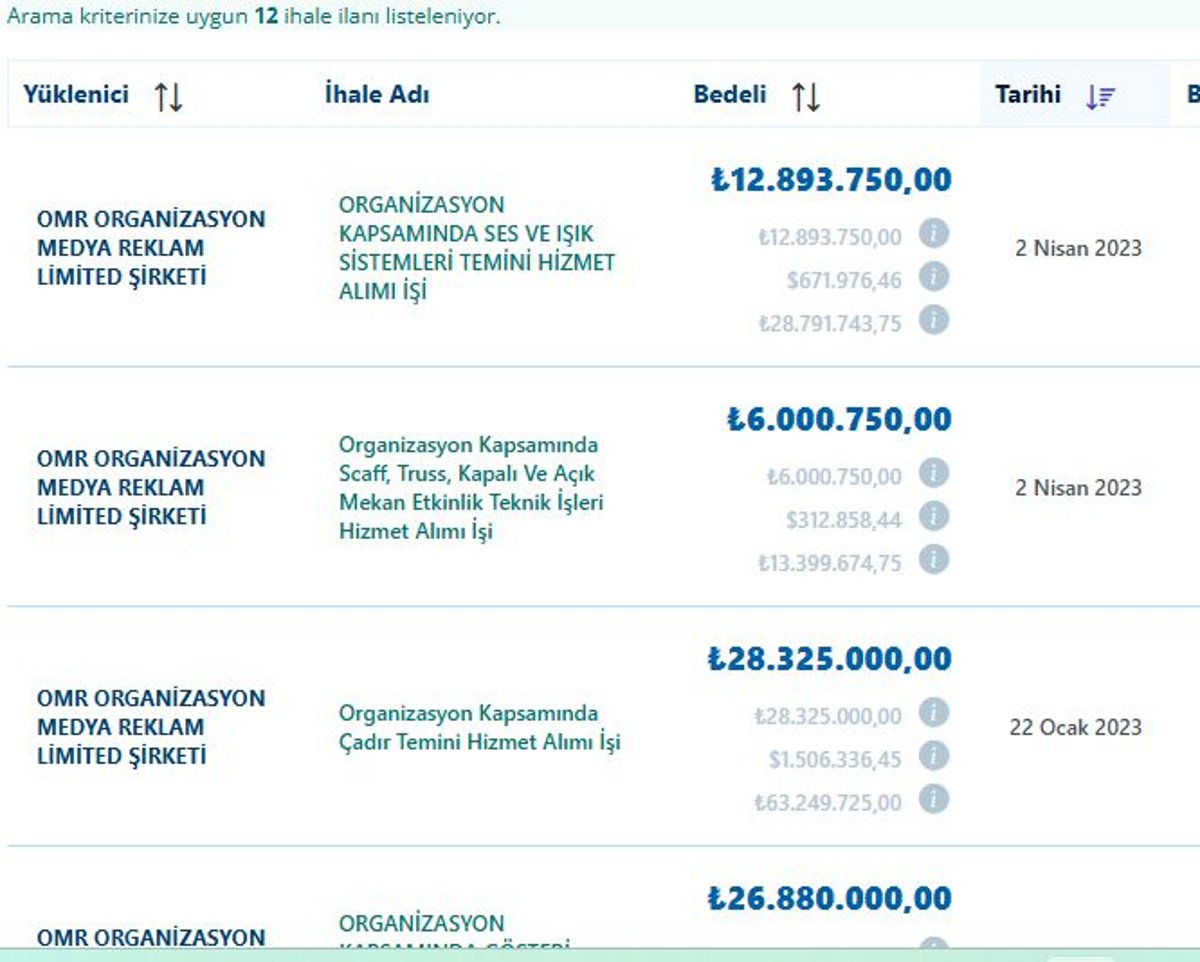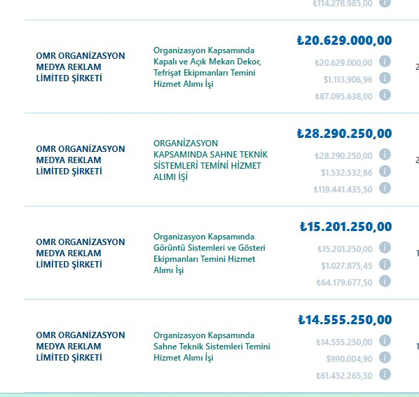 28 Eylül 2022’de Kültür AŞ, aynı gün içinde iki ayrı ihale yaptı: “Kapalı ve açık mekan dekor, tefrişat ekipmanları temini” ile “Görüntü sistemleri temini”. Her iki ihale de OMR Organizasyon’a verildi ve toplam bedel 47 milyon 700 bin TL oldu. İki gün sonra, 30 Eylül 2022’de yapılan “Sahne teknik sistemleri hizmet alımı” ihalesi de 28 milyon 290 bin TL ile aynı şirkete gitti.