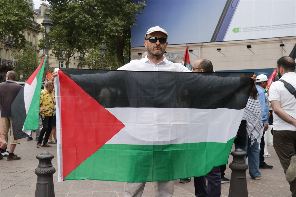 Fransa Filistin Dayanışma Derneğinin (AFPS) çağrısı ile yüzlerce kişi Paris'teki Saint-Michel Meydanı'nda toplandı.