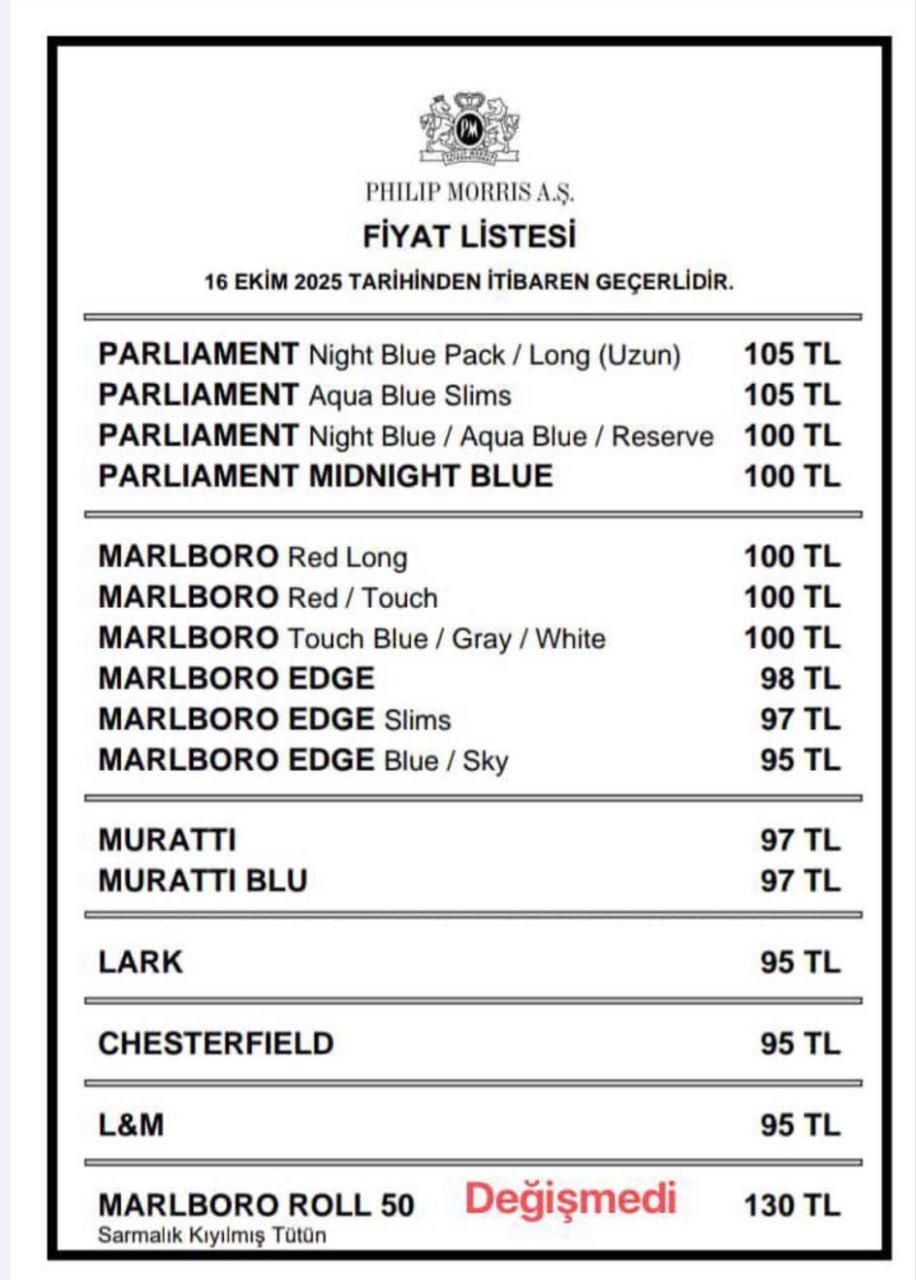 Philip Morris sigara grubu, 16 Ekim 2025 tarihinden itibaren geçerli olmak üzere ürünlerine zam yaptı. Yeni fiyat listesiyle birlikte en pahalı sigara 105 TL'ye ulaşırken, en düşük fiyatlı ürünler 95 TL seviyesinde yer aldı.