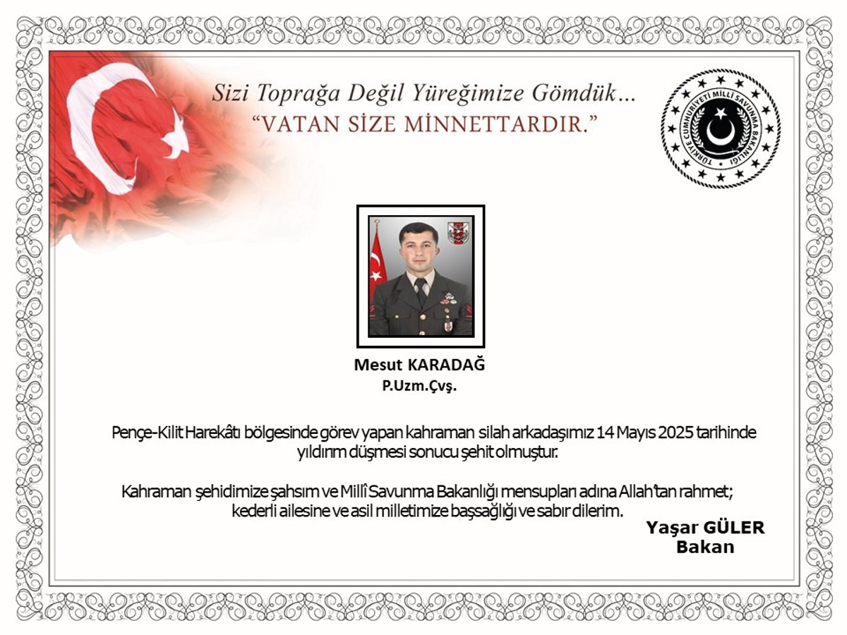 Bakanlıktan yapılan yazılı açıklamada, "Pençe-Kilit Harekatı bölgesinde görev yapan kahraman silah arkadaşımız Piyade Uzman Çavuş Mesut Karadağ, 14 Mayıs 2025 tarihinde yıldırım düşmesi sonucu şehit olmuştur. Bizleri derin bir acı ve üzüntüye boğan bu olayda hayatını kaybeden aziz şehidimize Allah'tan rahmet, kederli ailesine, Türk Silahlı Kuvvetleri ile asil milletimize başsağlığı ve sabır dileriz" ifadelerine yer verildi.