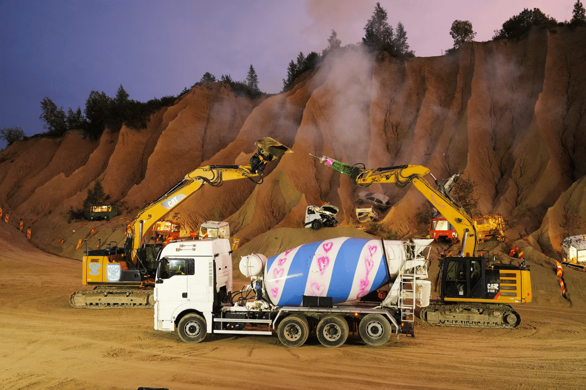 Juliet karakteri kırmızı bir Ford pickup ile canlandırılırken, Romeo’yu büyük bir kamyon temsil ediyor. Şehir otobüsleri, itfaiye araçları ve kalpli bir çimento kamyonu da sahnedeki diğer karakterlerin yerine geçiyor.