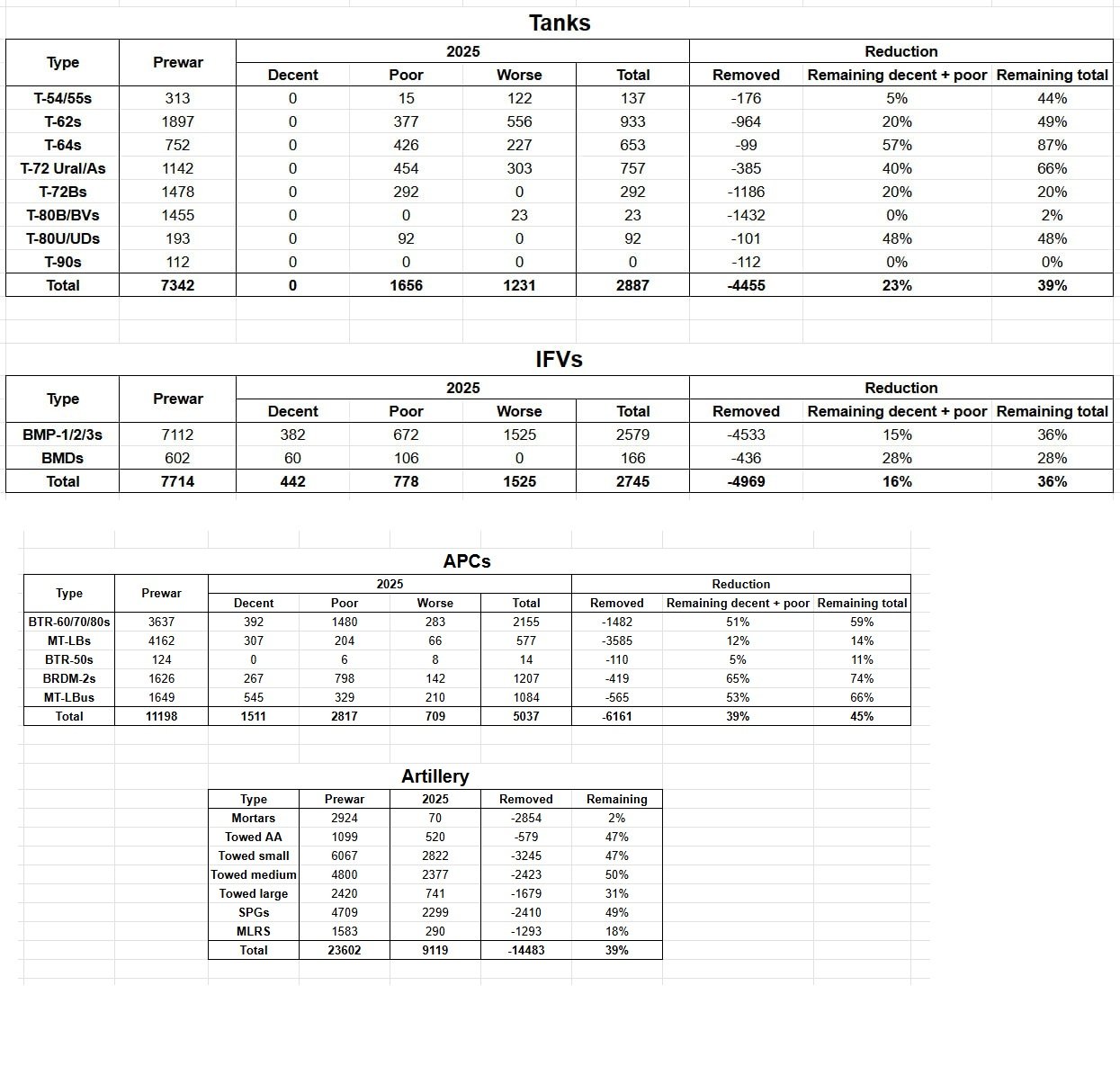 Savaş öncesi yaklaşık 7.342 tank yedeği, 2025 itibarıyla yaklaşık 2.887 adede düşmüş durumda. Bu, depolardan yaklaşık 4.400 tankın çıkarıldığı anlamına geliyor. Ancak bu tankların yalnızca %23’ü kullanılabilir durumda; geri kalanlar ya hurdaya çıkarılmış ya da parçalarına ayrılmış durumda.
