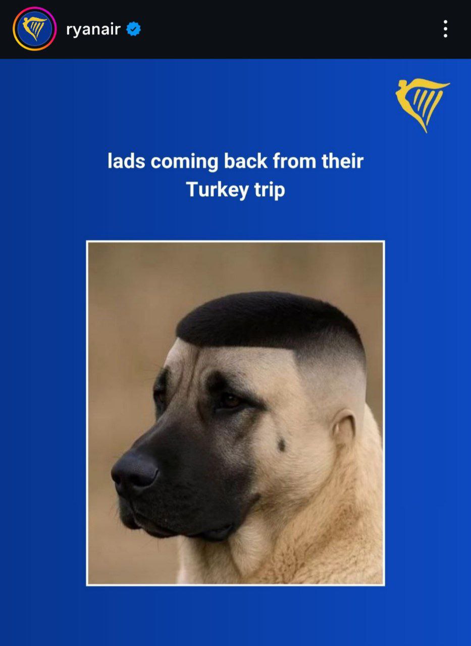 - İrlandalı havayolu şirketi Ryanair, sosyal medyada Türkiye'deki kuaför ve saç stili kültürünü hedef alan tıraşlı hayvan görselleriyle (domuz, maymun vb.) bir dizi paylaşım gerçekleştirdi.