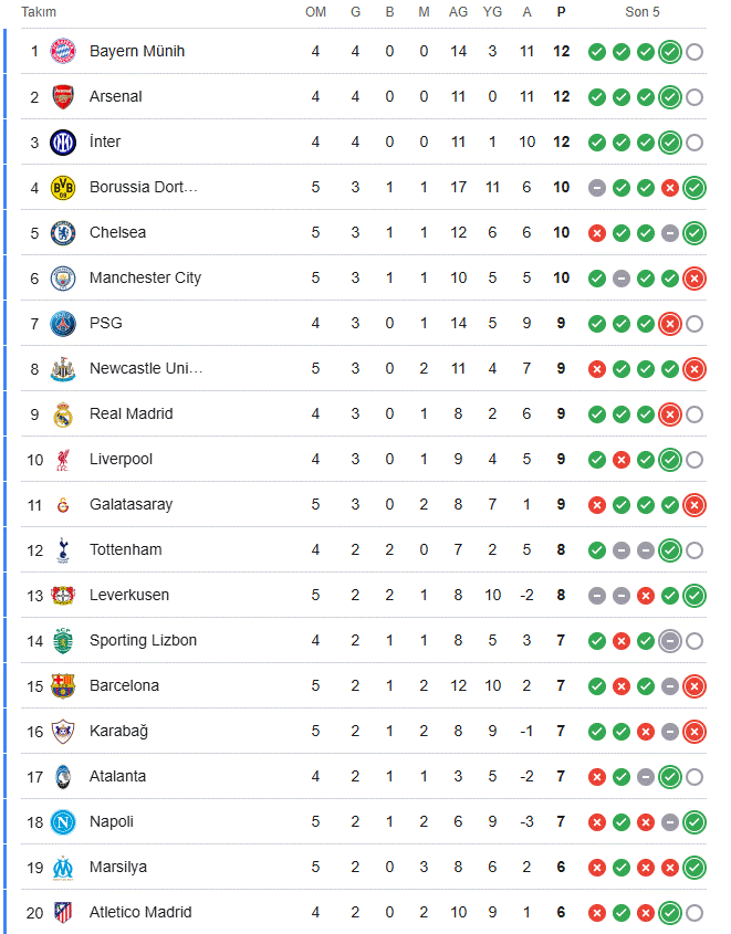 - Marseille 2-1 Newcastle UnitedŞAMPİYONLAR LİGİ PUAN DURUMU