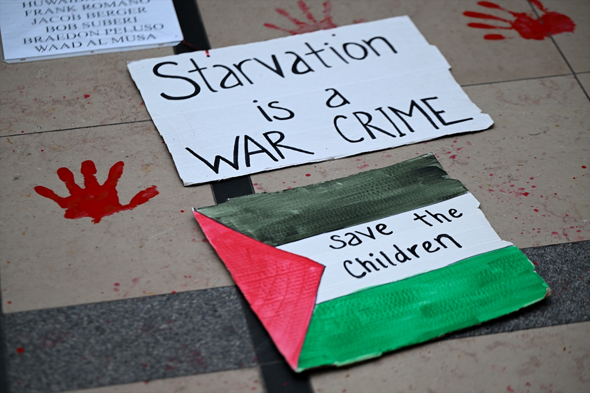 Protestoculardan biri açlıktan ölmekte olan Filistinli bir çocuğun fotoğrafını tutarak İsrail’in bilinçli olarak açlıktan öldürdüğü sivillere dikkat çekti.
