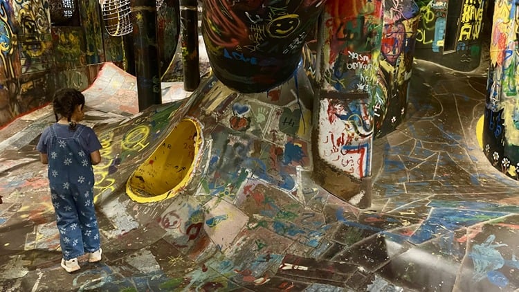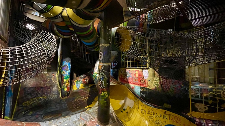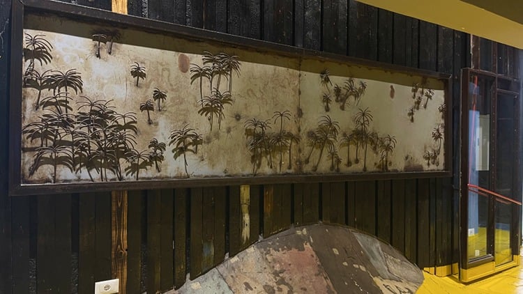 - Kafede savaşta kalan havan toplarından yapılan avizeler, hurda metallerden oluşturulmuş çocuk parkı ve sanat atölyeleri yer alıyor.