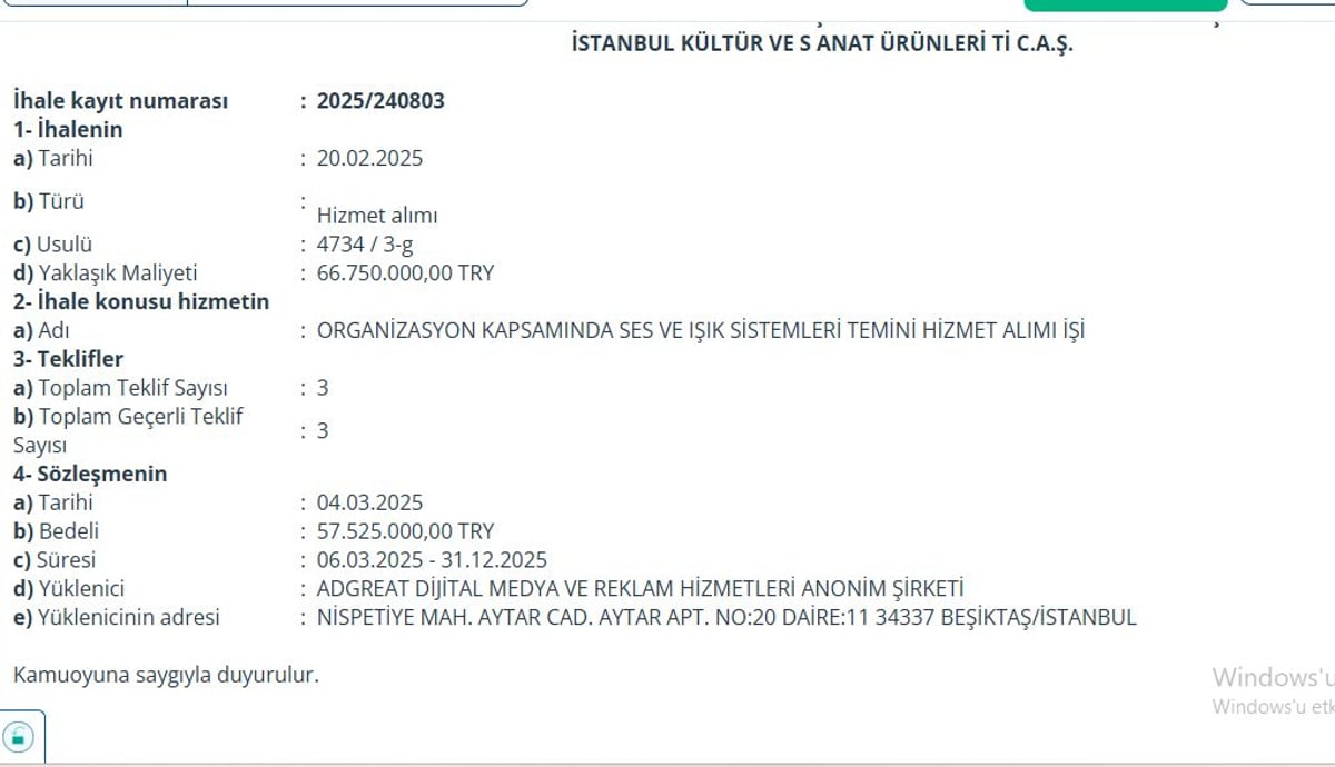 - 3 Mart 2025’te yapılan “Organizasyon kapsamında ses ve ışık sistemleri temini” ihalesi 57 milyon 525 bin TL’ye verildi.
