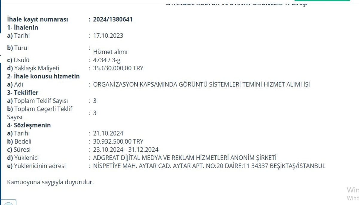 - 21 Ekim 2024’te yapılan “Organizasyon kapsamında görüntü sistemleri temini” ihalesinin bedeli 30 milyon 932 bin TL oldu.