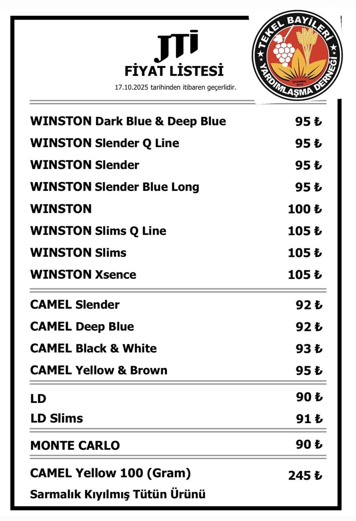İstanbul Tekel Bayileri Yardımlaşma Derneği tarafından paylaşılan JTI grubunun güncel fiyat listesi şu şekildedir:
