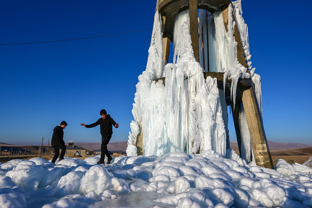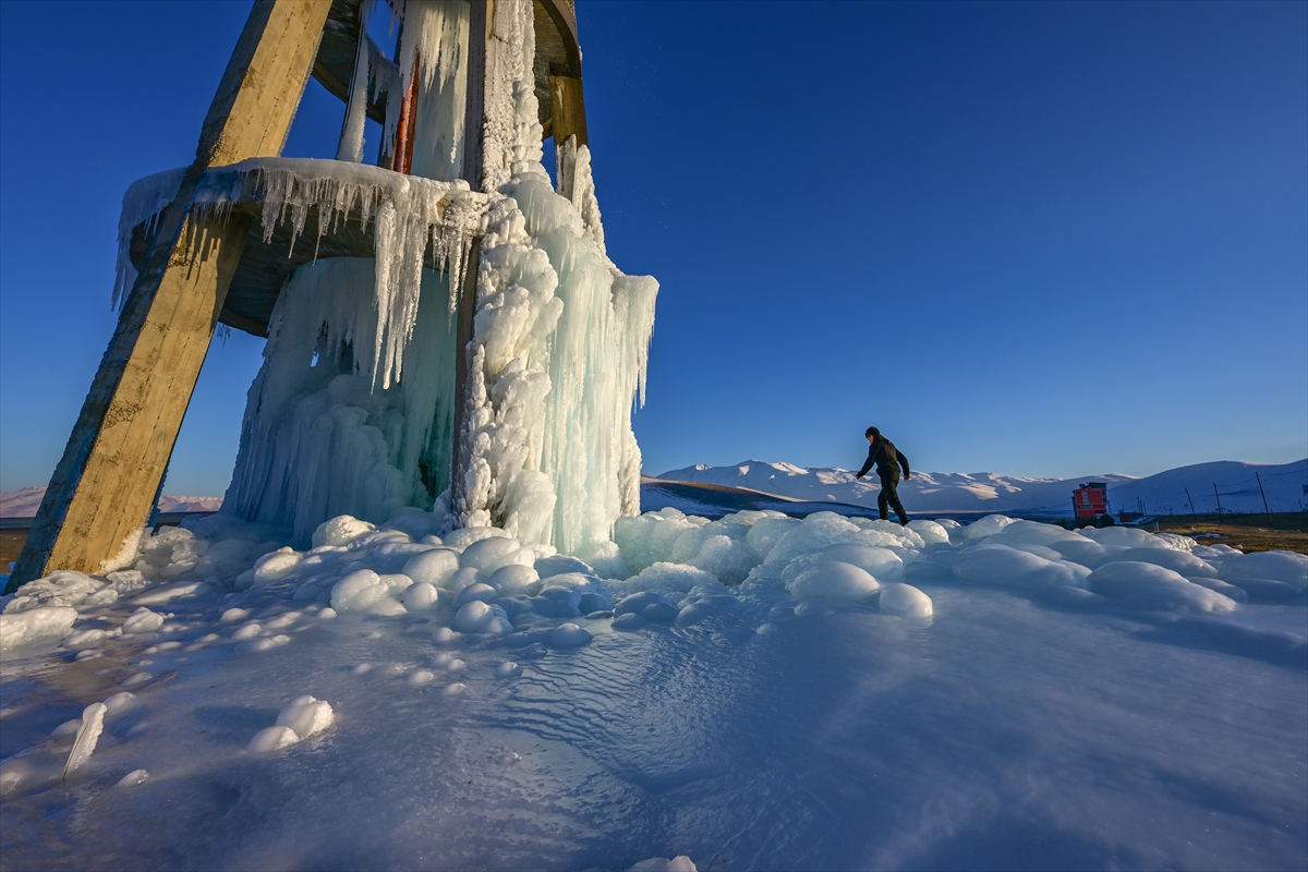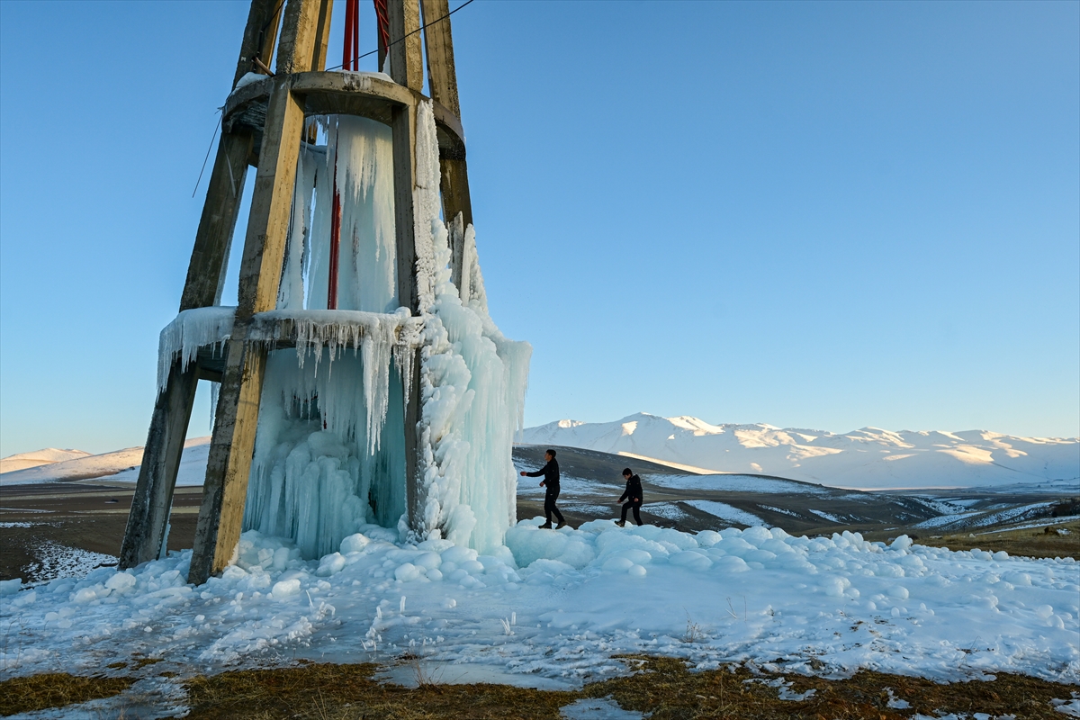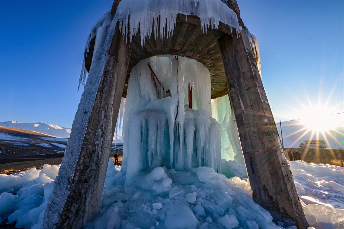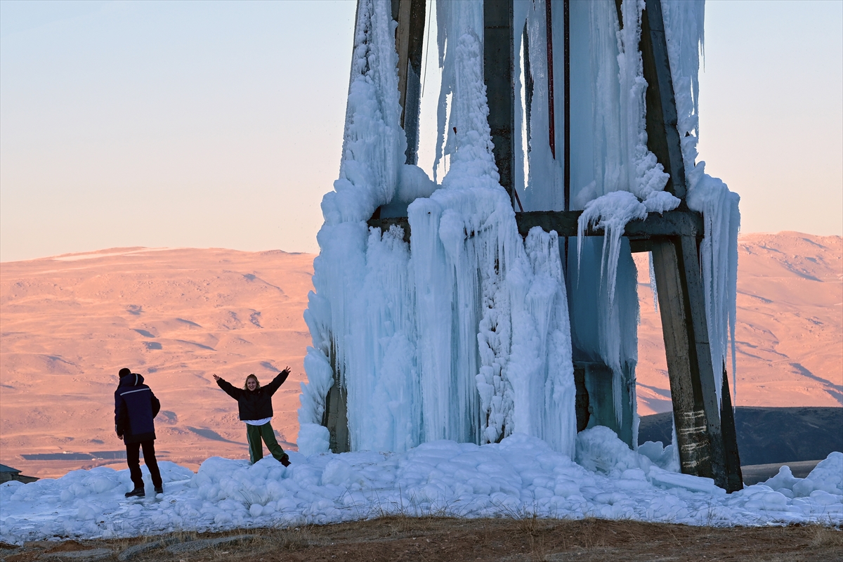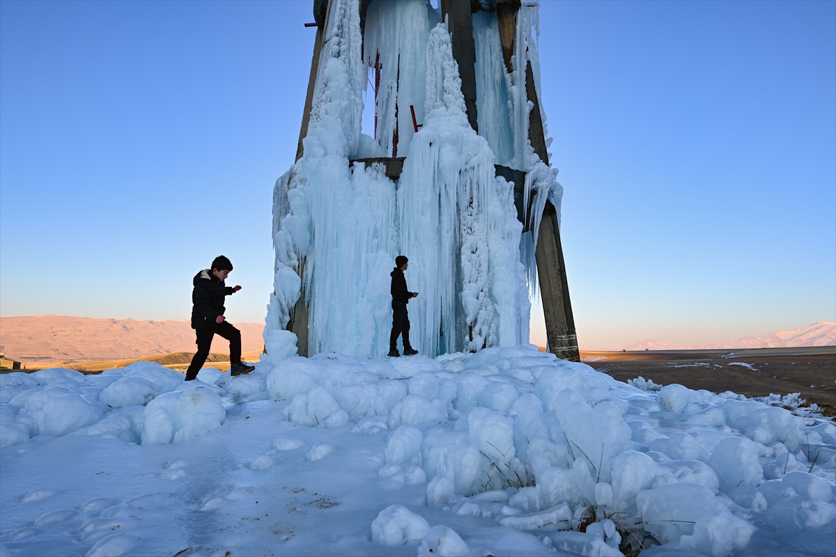 Van'ın Gevaş ilçesinde bir su deposunda, aşırı soğuk nedeniyle patlayan borulardan akan suların donmasıyla oluşan buz sarkıtları ilginç görüntü oluşturdu.