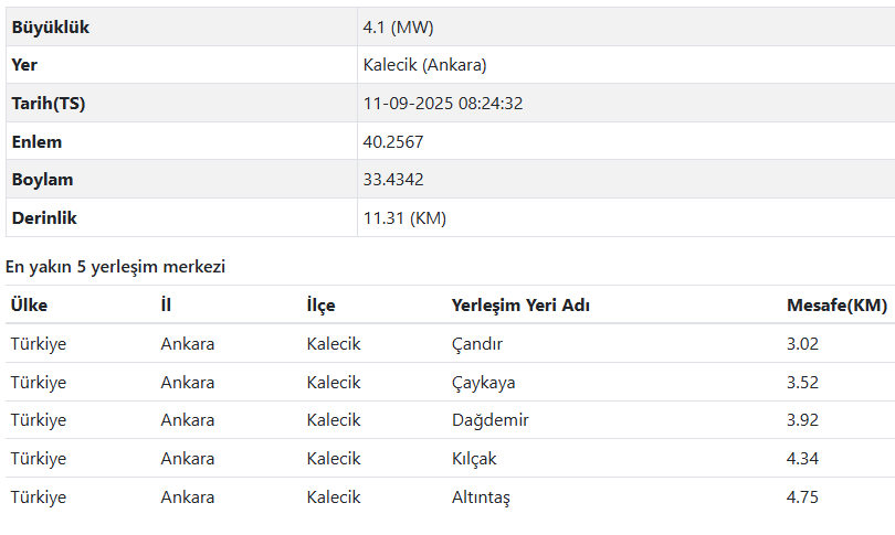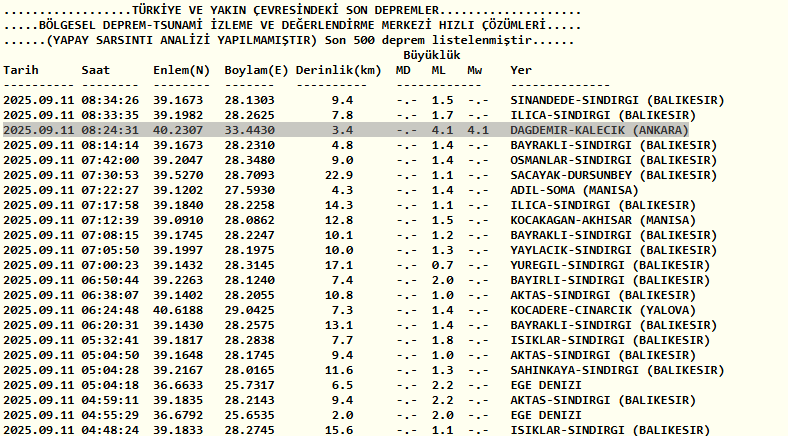 Ankara deprem gelişmesine ilişkin bilgiler ve AFAD Kandilli Rasathanesi son depremler listesi verileri şöyle;