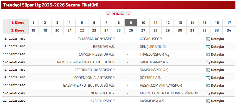 SÜPER LİG 9. HAFTA FİKSTÜRÜ