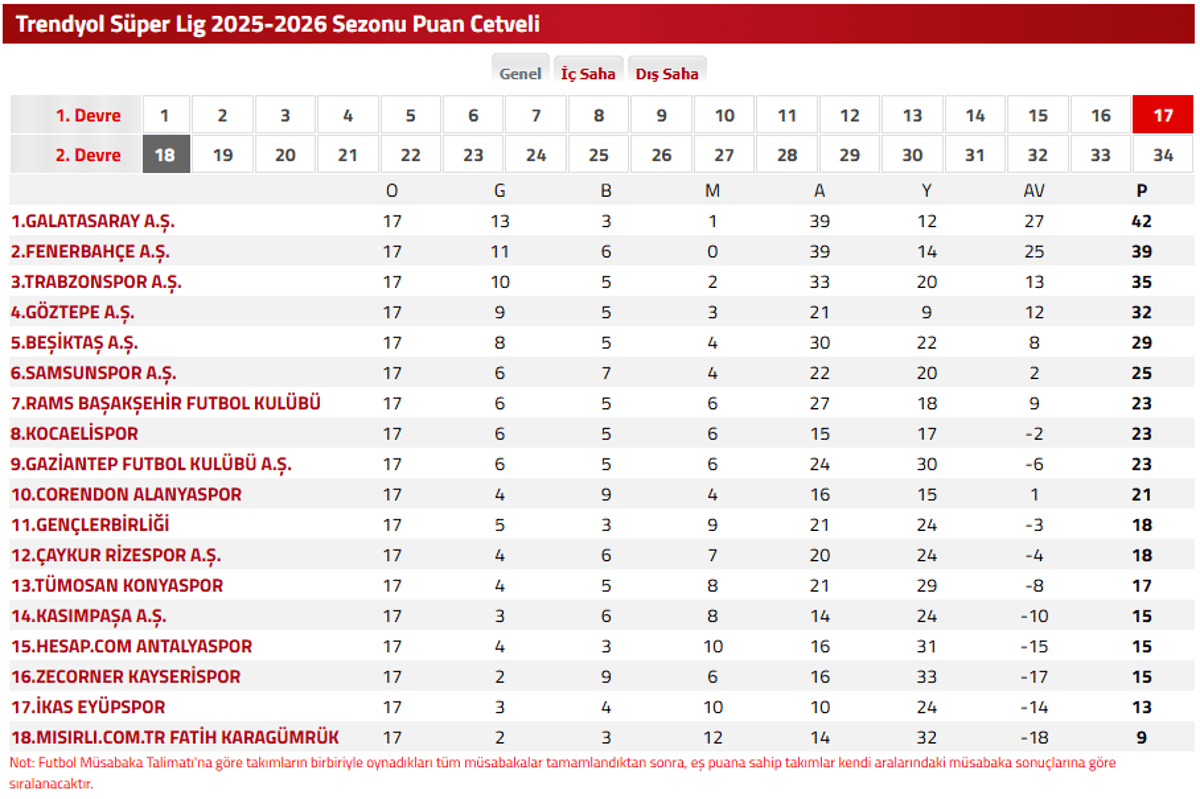 Süper Lig’in 17. haftasında en son oynanan maçların ardından şekillenen puan durumu şöyle;