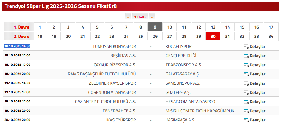 SÜPER LİG 9. HAFTA MAÇ PROGRAMI